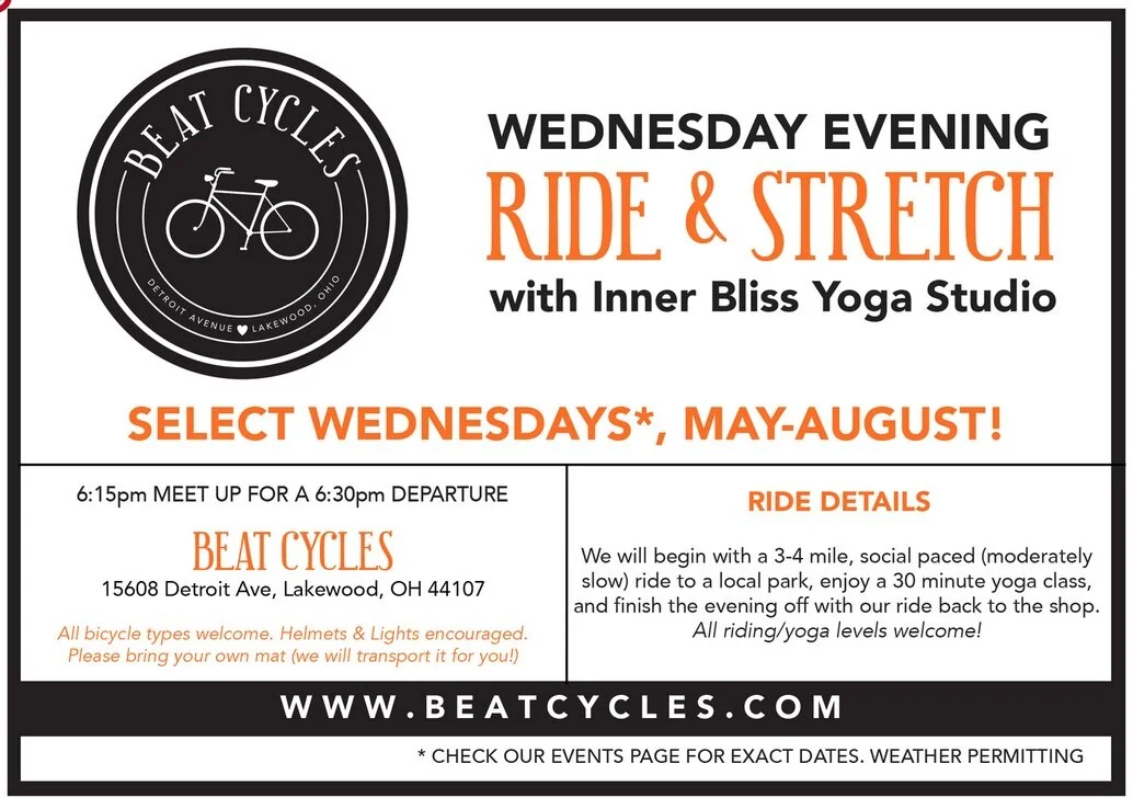Inner Bliss is joining Beat Cycles to offer Ride and Stretch, a cycling & yoga experience on select Wednesday evenings, May 6 - August 26.