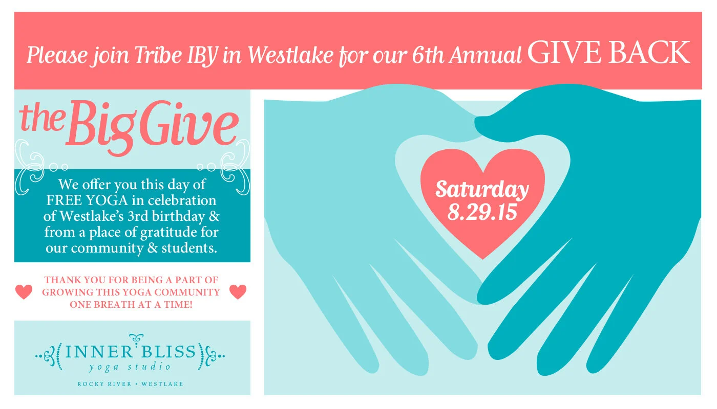 Please join Tribe IBY for our annual Give Back, a day of FREE YOGA, on Saturday, August 29, 2015 at our Westlake studio.